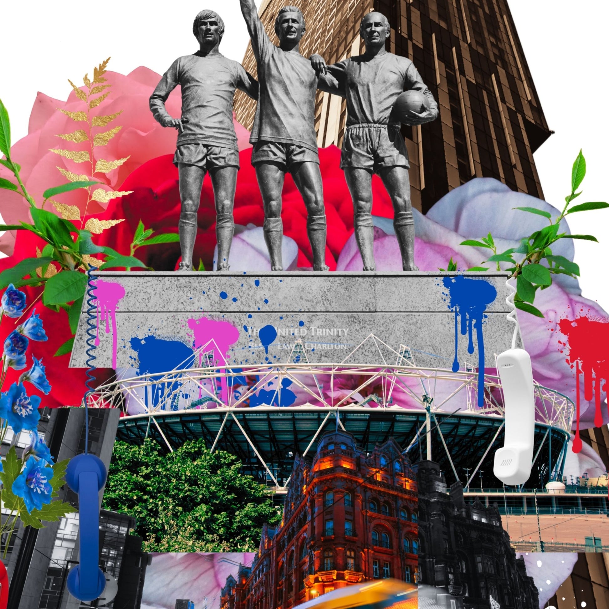 Inspired by Manchester, this collage layers the city’s powerful sporting legacy with its modern skyline and unmistakable northern energy. At its core stands Old Trafford, alongside the legendary United Trinity Statue — honouring George Best, Denis Law and Bobby Charlton, the trio who helped Manchester United become the first English club to lift the European Cup in 1968.